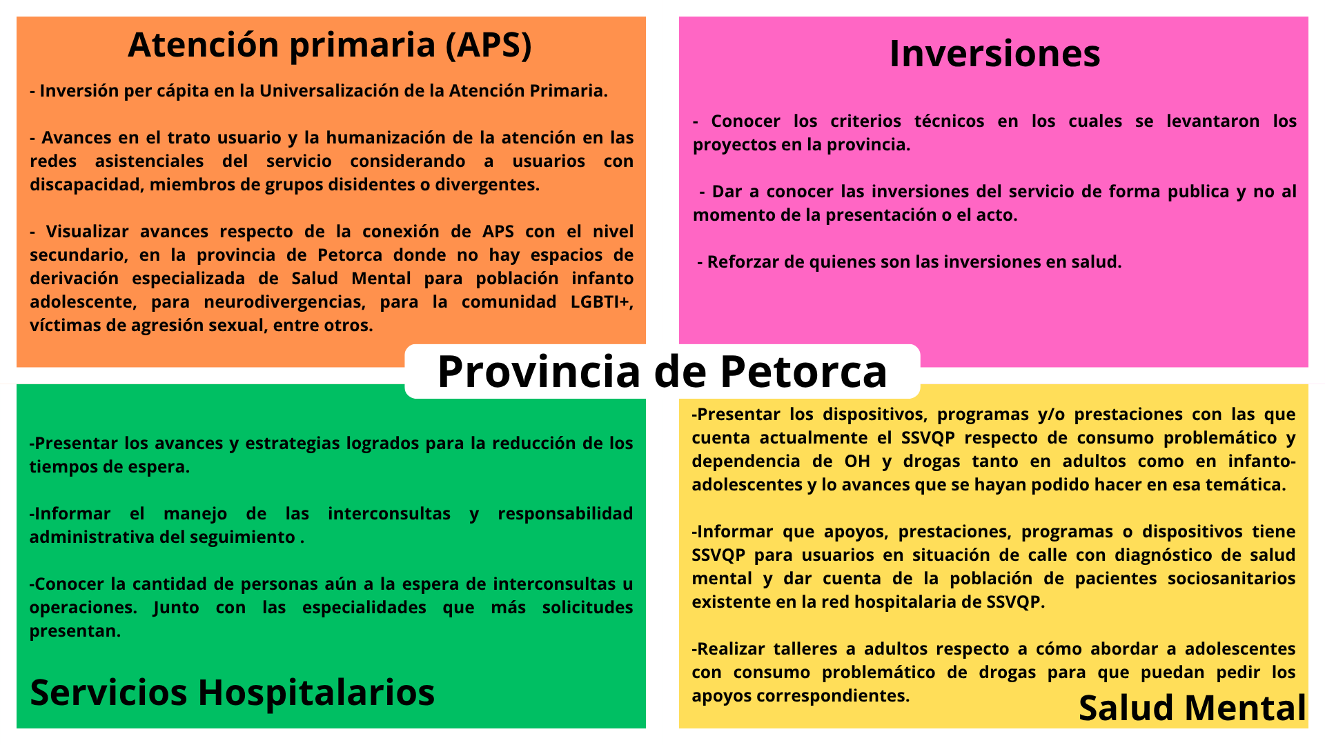 En la oportunidad, y a través de recursos audiovisuales, se dio a conocer la gestión del SSVQP, en materia de avances en atención primaria, atención prehospitalaria, atención secundaria y terciaria, con los logros en los programas del ciclo vital, así como la atención en el área hospitalaria, relacionados con listas de espera, gestión de tiempos de espera, Plan Nacional del Cáncer, farmacia, laboratorio, rehabilitación, también el área de inversiones, finanzas, gestión del cuidado, participación social, acreditación, relaciones laborales, entre las muchas áreas de gestión de esta gran red asistencial.