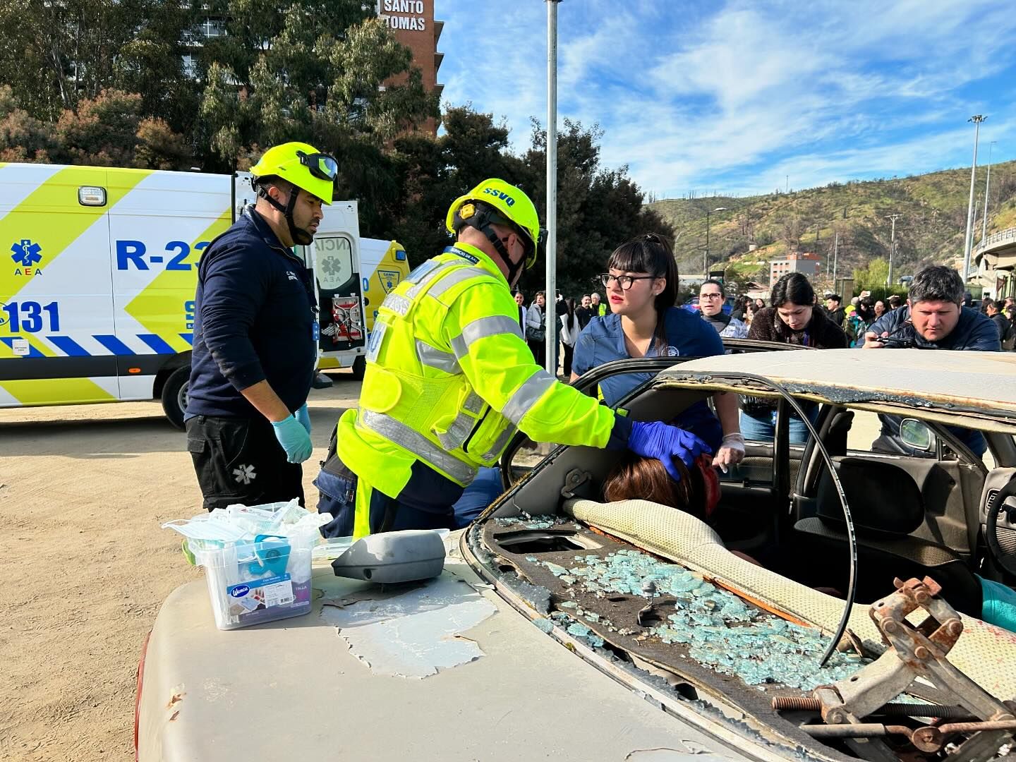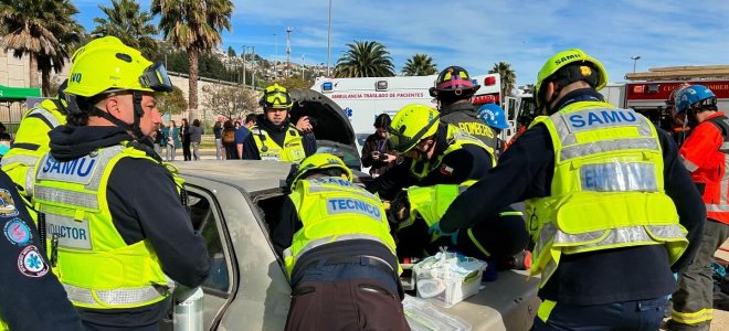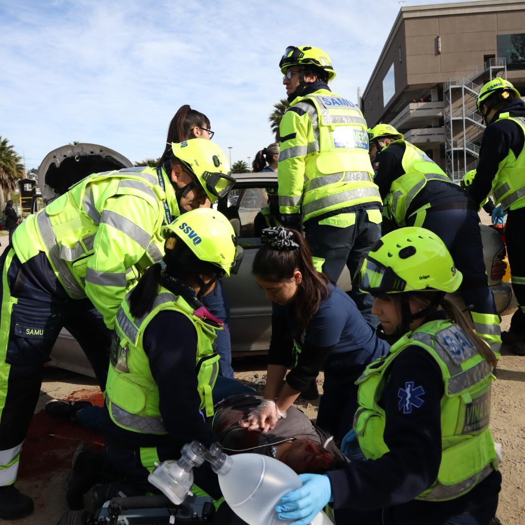 La jornada, que simuló una fatal colisión automovilística, contó con la participación del SAMU SSVQP, Bomberos, la Sección de Investigación de Accidentes de Tránsito de Carabineros (SIAT), estudiantes del área de la salud de la Universidad Santo Tomás y las corporaciones municipales de Quilpué y Viña del Mar.