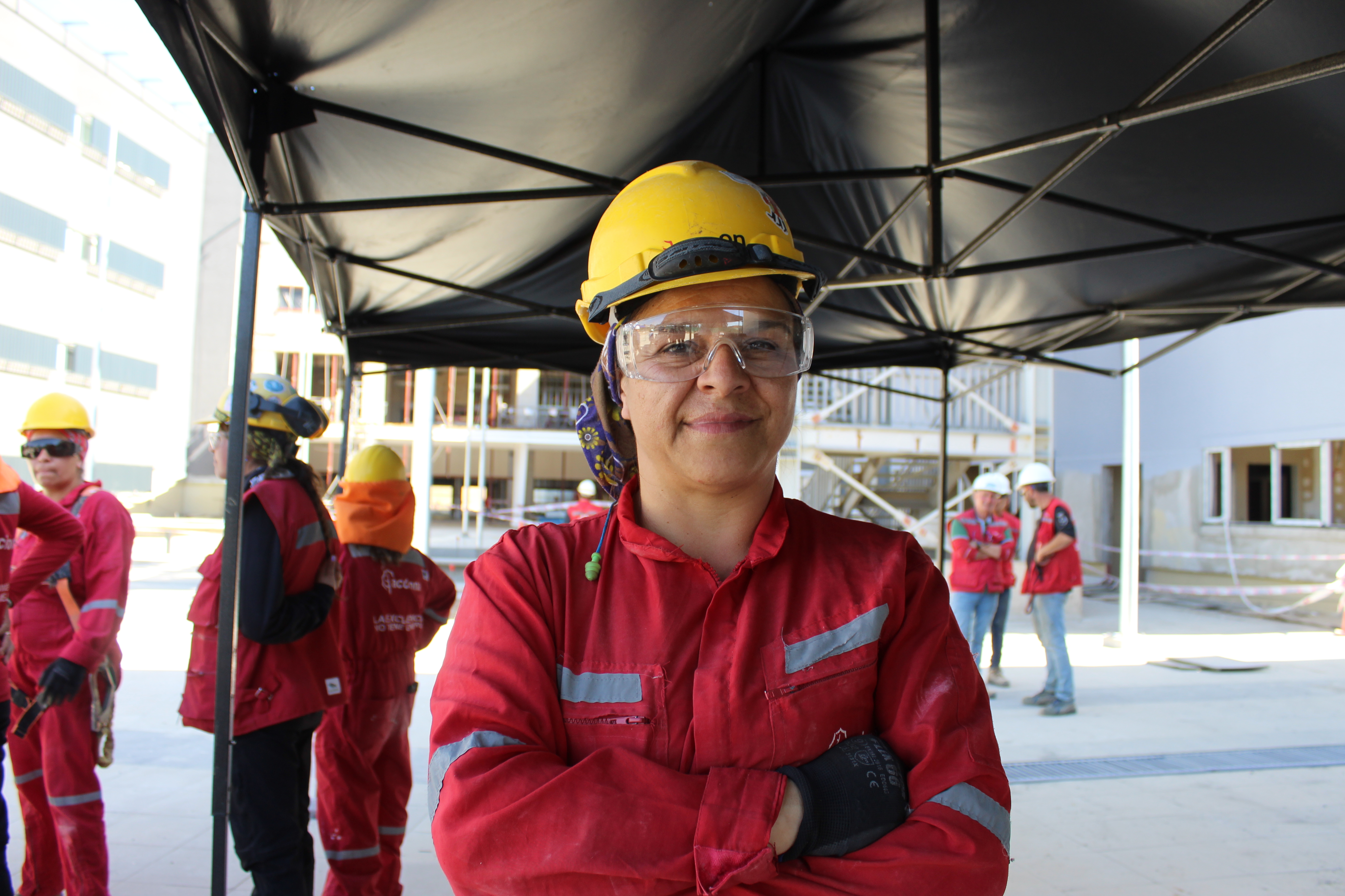 Alexia San Martín, es la más joven de las trabajadoras “ entré acá con 20 años y partí con carpintería y nos tiraron a terreno para empezar en la obra y luego me pasé a moldaje. Entonces hacía moldaje, carpintería y hormigón, y otras compañeras hacían fierro. Después hice pegas de obra civil: hormigón, sobrelosas, y quedé en tabiquería, que es lo que más me gusta, es entretenido estructurar, darle forma al edificio, se van viendo los cambios y se abren nuevas partidas”