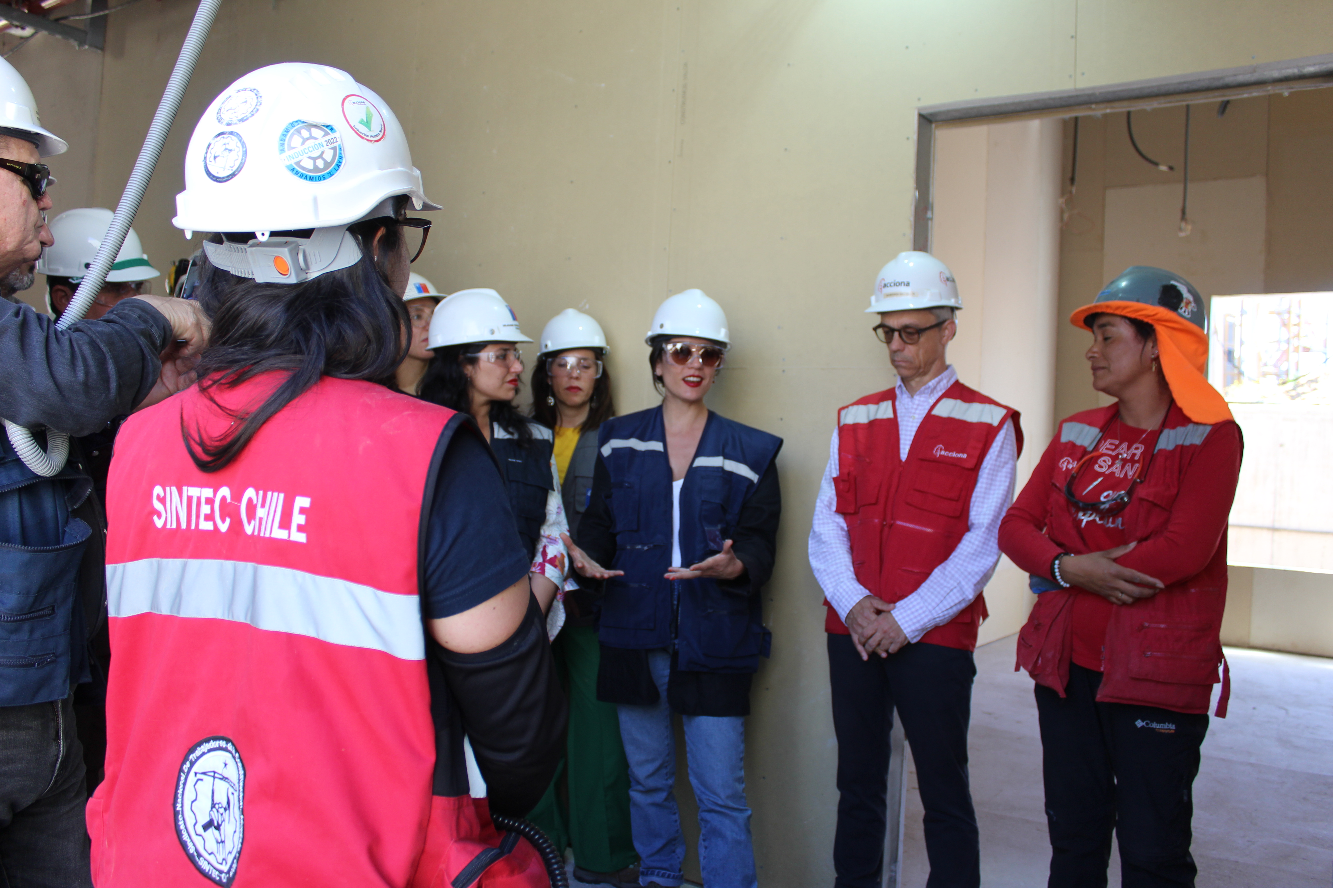 En su recorrido, la Ministra Camila Vallejo, se dio el tiempo para conversar con algunas de las mujeres que trabajan en la obra, principalmente en la construcción del Jardín Infantil y la Sala Cuna hospitalaria, quienes les contaron sus experiencias tras capacitarse para realizar labores de construcción.