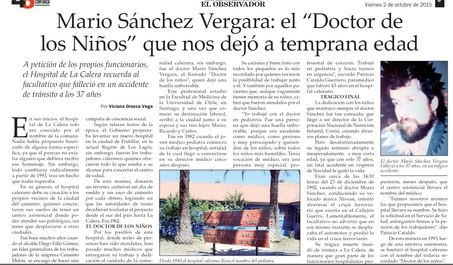 Para cumplir su internado, en 1982, llega al Hospital de La Calera el Dr. Mario Sánchez Vergara, quien se especializa en pediatría. El médico es muy valorado por toda la comunidad, tanto de funcionarios como de usuarios y usuarias, a quienes atendía tanto en el centro asistencial como en los domicilios. El 23 de diciembre de 1992, el médico sufre un trágico accidente, al ser arrollado el automóvil en que viajaba, por un ferrocarril en un cruce cerca de la ciudad, perdiendo la vida a los 37 años. La comunidad consternada, pide que el Hospital lleve su nombre.