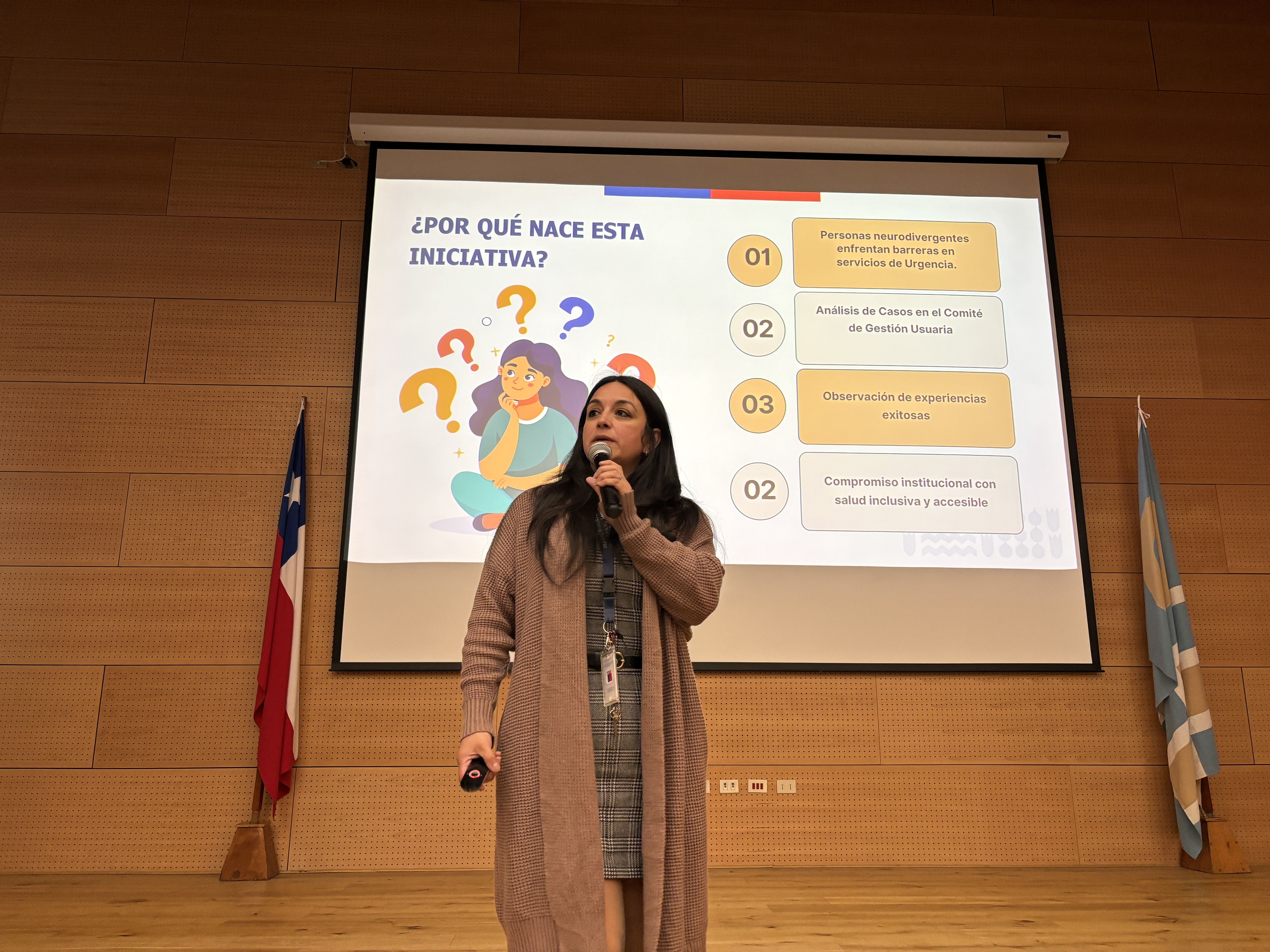 En la jornada, se expuso sobre iniciativas innovadoras, la Directora del Hospital Adriana Cousiño de Quintero, Carla Cárdenas, compartió el nuevo sistema de atención para niños y niñas con condiciones neurodivergentes, implementando la inclusión desde el momento en que el paciente accede a la Unidad de Emergencia (UE).